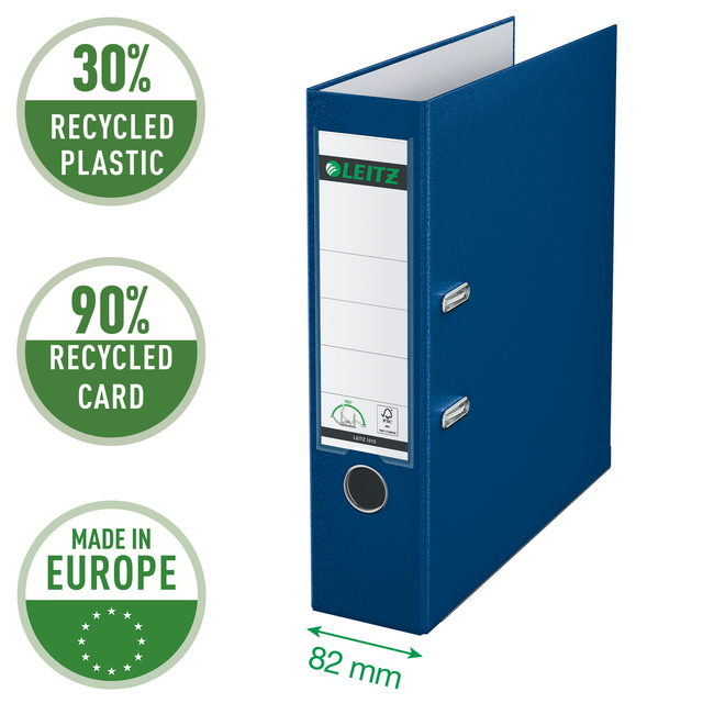 Hoge kwaliteit ordner voor dagelijks gebruik. Deze blauwe ordner is speciaal ontworpen voor intensief dagelijks gebruik. *Producteigenschappen; * Uniek gepatenteerd mechaniek dat 180° opent: 50 % grotere opening en 20 % sneller opbergen. * Zeer stevige omslag gemaakt van 30% pre-consumer gerecycled PP-folie en PE-gelamineerd papier aan de binnenkant op stevig 90% post-consumer gerecycled karton voor langere duurzaamheid. * Met duimgat, hefboommechaniek en metalen kaftranden * Labelhouder op de rug maakt het wisselen van labels mogelijk. * Capaciteit 600 x A4 (80 grams papier)