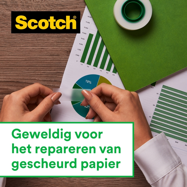 Scotch® Magic™ Tape is de originele, onzichtbare tape met een matte afwerking om kleine onvolkomenheden thuis, op school en op kantoor te repareren. De klevende tape geeft u een sterke, veilige en permanente afdichting dankzij de vertrouwde lijmtechnologie van 3M, die doorzichtig wordt na het aanbrengen. Het heeft een gemakkelijk aan te brengen ontwerp en is fotoveilig, droogt niet uit en vergeelt niet. Scotch® Magic™ Tape is verkrijgbaar in diverse breedten en lengten en past in allerlei plakbandhouders. De onzichtbare Scotch® van het merk 3M maakt gebruik van de vertrouwde hechtingstechnologie van 3M voor hechting op papier. * Scotch® Magic™ Tape ziet er mat uit op de rol, maar wordt doorzichtig na het gebruik op de meeste papiersoorten. * Perfect voor permanent papierherstel, het inpakken van documenten, het inpakken van cadeaus, het verzegelen van enveloppen, het mooi maken van foto's, het labelen van containers en meer. * Te beschrijven met een pen, potlood of stift. * De sterke klevende tape rolt soepel van de rol, is gemakkelijk af te rollen, af te scheuren, aan te brengen en te gebruiken. * Scotch® Magic™ Tape aanvulrollen zijn compatibel met alle bureaudispensers van het merk Scotch®, voor een eenvoudig gebruik. Ze kunnen ook los gebruikt worden. * 4 rollen, 19 mm x 33 m.