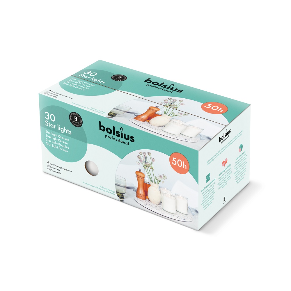 Kaars in glas Star light van Bolsius Professional. Kleur: Transparant Branduren: Ca. 50.Afmeting: 68x82 mm. Verpakking: Doos 30 stuks