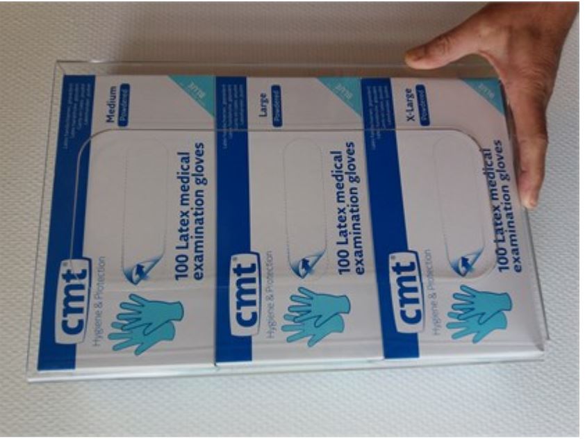 In de CMT 3397 wandhouder passen 3 dispenserdoosjes disposable handschoenen. De open wandhouder is gemaakt van transparant acryl. Hierdoor zie je in een oogopslag welke handschoenen je te pakken hebt. Afmeting :39x26x10cm