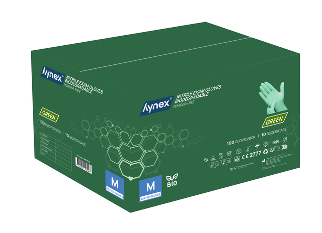 Duurzaam & comfortabel: biologisch afbreekbare nitril wegwerphandschoenen van Hynex Ontdek de nieuwste toevoeging aan het Hynex-assortiment: biologisch afbreekbare nitril wegwerphandschoenen. Met de introductie van deze biologisch afbreekbare handschoenen zetten we een logische stap in onze duurzame koers – zonder concessies te doen aan het ultieme draagcomfort en de optimale bescherming. En zoals je van Hynex gewend bent, geniet je nog steeds van de beste prijs-kwaliteitverhouding. Kies voor milieuvriendelijk gemak, zonder in te leveren op prestaties! Biologisch afbreekbare nitril wegwerphandschoenen De biologisch afbreekbare nitrilhandschoenen vormen een duurzaam alternatief. Dankzij de innovatieve toevoeging van bio-agentia in de formule behouden ze dezelfde betrouwbaarheid als gewone nitril wegwerphandschoenen. Dit betekent dat ze, zodra ze in contact komen met specifieke micro-organismen in de bodem, op natuurlijke wijze worden afgebroken zonder schadelijke resten achter te laten. Voor jouw gebruiksgemak Gemaakt van 100% biologisch afbreekbaar nitril, zijn deze handschoenen poedervrij en oppervlakte-gechloreerd voor extra comfort. Ze bieden een superieure sterkte, verbeterde lekbestendigheid en uitstekende chemische spatbescherming. Nitril heeft als eigenschap dat dit goed vormt naar de hand tijdens gebruik. Hierdoor heb je een goede grip, ook bij het werken in of met natte of geoliede producten of omgevingen. De getextureerde vingertoppen zorgen voor een betere grip bij zowel natte als droge omstandigheden, terwijl ze ook zorgen voor een optimale tastgevoeligheid waardoor ze een precieze aanraking mogelijk maken. Bovendien bieden deze handschoenen betrouwbare bescherming tegen bacteriën en schimmels. De gekrulde rand extra biedt extra gemak bij het aan- en uittrekken, zorgt ervoor dat vloeistoffen niet langs de arm lopen en voorkomt het terugdraaien van de handschoenen. Bovendien zijn ze zowel links als rechts te dragen Sterk en betrouwbaar Nitril wegwerphandschoenen zijn sterker dan latex, rubber of vinyl handschoenen. Ze voorkomen besmettingsgevaar tijdens werkzaamheden waar hygiëne voorschriften belangrijk zijn. Werk je in de voedingsmiddelenindustrie, laboratoria, horeca of zorgsector? Dan zijn deze handschoenen de beste keuze! Nitril voor iedereen Verminder de kans op een latex allergie door puur en alleen nitril handschoenen te gebruiken. Tijdens het gebruik wordt huidirritatie voorkomen doordat de nitril handschoenen latex- en poedervrij zijn. Let op: niet steriel en geschikt voor eenmalig gebruik. Draag wegwerphandschoenen niet te lang, probeer ze elk 2 uur te vervangen voor een nieuw paar. Specificaties:  * Materiaal: Nitril * Ongepoederd & latexvrij * Maat: M * Kleur: Groen * Grammage: 3,5 gr * Verpakking: 100 stuks per doos * Niet steriel