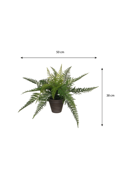 Klaar om zorgeloos te genieten? De kunstplanten van Mica Decorations zijn niet van echt te onderscheiden, maar hebben geen enkel onderhoud nodig. Deze groene varen valt op door de groene, diep ingesneden, krullende bladeren. Levensecht, maar met alle voordelen van een kunstplant. De plant is al gemodelleerd en stevig verankerd in een unieke, terracotta bloempot met basalt grijze pigmenten. Na aankoop kan de plant dus direct worden neergezet, of gebruik de meegeleverde pot als stevige basis voor een sierlijke overpot. De plant heeft een hoogte van 38 cm en een diameter van 50 cm.