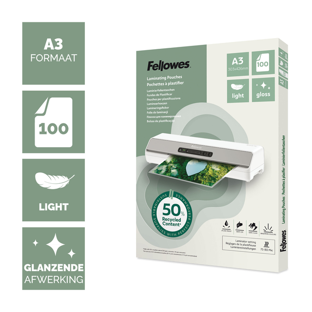 Eigenschappen "Lamineerhoes Fellowes A3 2x75micron recycled glans 100stuks"
