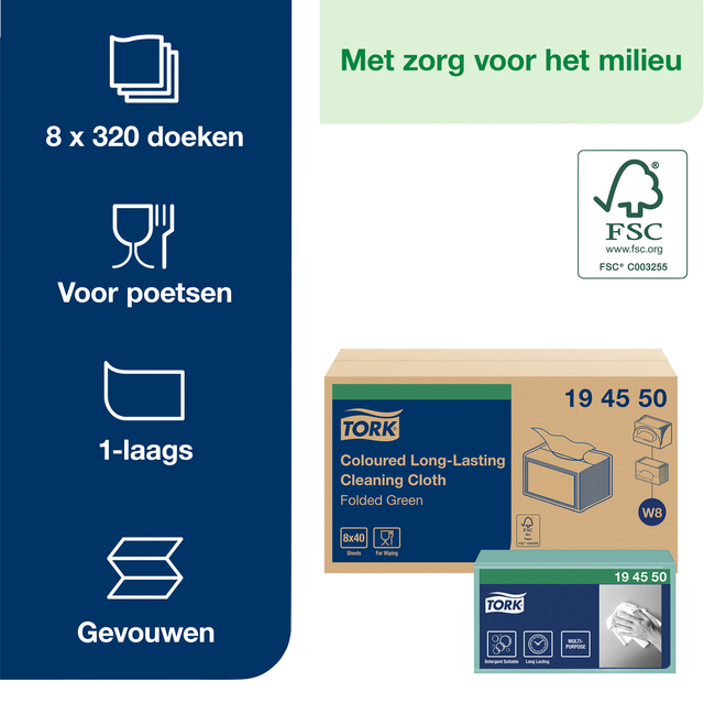 * Tork Long Lasting gevouwen reinigingsdoek W8 is multifunctioneel en geschikt voor allerlei schoonmaakwerkzaamheden waarbij sterkte en absorptie nodig is. * Deze doeken voldoen aan je reinigingswensen en zijn geschikt voor de meeste schoonmaakproducten. * De duurzame absorberende doeken kunnen meermaals gebruikt worden en zijn verkrijgbaar in diverse kleuren om kruisbesmetting te voorkomen. * Deze doeken zijn geschikt voor de Tork W8 small pack dispensers. * De doeken zijn voorzien van het FSC-keurmerk. * Afmeting 105 x 160 x 195 mm.