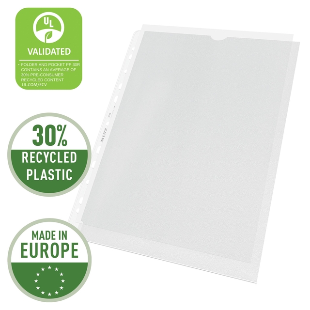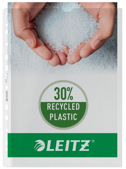 Leitz Premium Showtas A4 geopend, boven en links, 30% gerecycled plastic Premium showtassen met een heldere matte afwerking, ideaal voor dagelijks gebruik thuis, op kantoor of op school. Met de 11-gaats versterkte strip kunnen documenten gemakkelijk worden opgeborgen in ordners en ringbanden en worden ze beschermd tegen vocht, stof en vuil. Opent aan de boven- en linkerkant, waardoor gemakkelijke toegang tot de inhoud mogelijk is zonder zonder dat je de ordner of ringband open hoeft te maken. Het copysafe en zuurvrije materiaal zorgt voor een langdurige bescherming van de documenten. Gemaakt van PP (polypropyleen) plastic met 30% pre-consumer content en 100% recyclebaar. • A4-showtas voor het beschermen, opbergen en presenteren van documenten thuis, op kantoor of op school • Gemaakt van 30% pre-consumer PP plastic, 100% recyclebaar • 11-gaats geperforeerde linkerzijde voor het handig opbergen van documenten in ordners en ringbanden • Copysafe en zuurvrij materiaal zorgt voor langdurige bescherming van de documenten • Opent aan de bovenkant voor eenvoudige toegang tot documenten zonder dat je de ordner of ringband open hoeft te maken. • Materiaal met matte reliëfafwerking voorkomt vingerafdrukken of vetvlekken • Stevig polypropyleen van 130 micron zorgt ervoor dat de showtas steeds opnieuw kan worden gebruikt • Doos van 100 showtassen