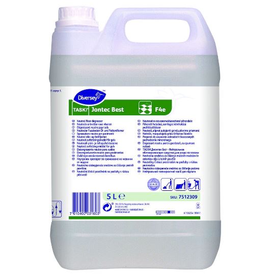 TASKI JONTEC BEST F4E 5L - NEUTRALE ONTVETTER VOOR VLOEREN Krachtige laagschuimende oplosmiddelhoudende vloerreiniger voor de verwijdering van minerale_synthetische olie vet rubber en wateroplosbaar vuil van alle waterbestendige harde vloeren. Kan in minimale dosering gebruikt worden op behandelde vloeren. pH neutraal Groot emulgerend vermogen Laagschuimend snelwerkend Veelzijdige toepassing Milieuverantwoord voor afvoer via het afvalwater Unieke gepatenteerde geur neutralisatie Odour Neutralizing Technology; O.N.T. Geschikt voor gebruik op alle waterbestendige harde vloeren Verwijdert snel en grondig minerale_synthetische olie vet bandensporen en wateroplosbaar vuil Ideaal voor schrobzuigmachines: laagschuimend voor snelle opname van de oplossing en optimaal gebruik van de watertank Tevens geschikt voor sproeireiniging met eenschijfsmachines en handmatige reiniging met een geschikt mopsysteem Geschikt om via een olie_vetafscheider te lozen De gepatenteerde geur neutralisatie Odour Neutralizing Technology; O.N.T. vernietigt onaangename geuren waardoor er een langdurige frisse achterblijft.