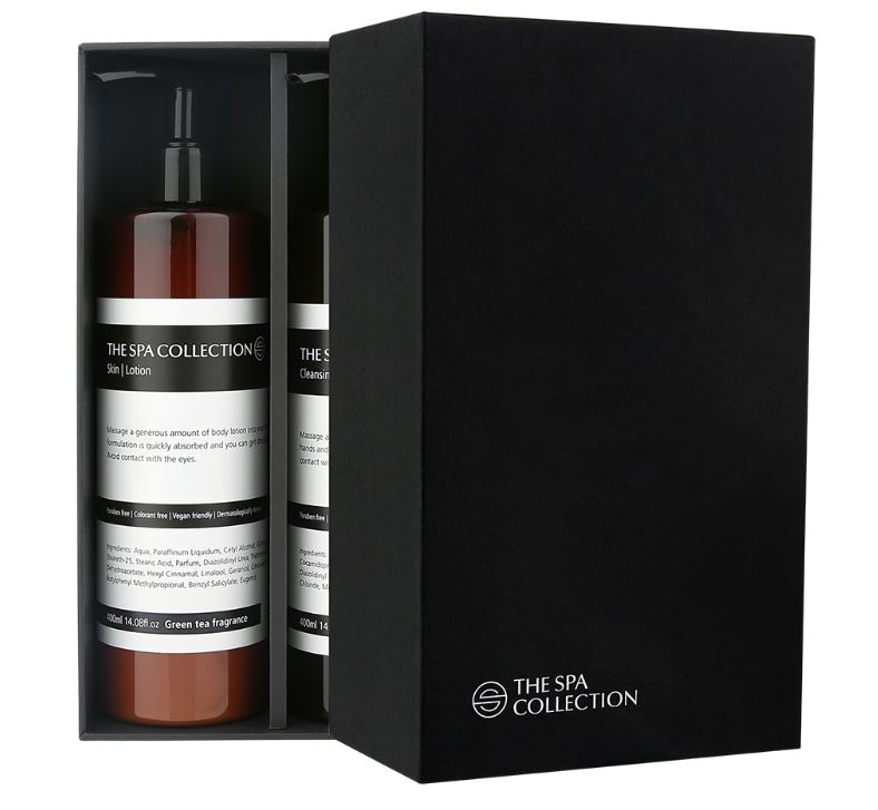 The Spa Collection Green Tea presenteert haar 400 ml flessen in een luxe giftbox. The giftbox bevat een 400 ml fles handzeep en een 400 ml fles hand en body lotion met een geur van groene thee.