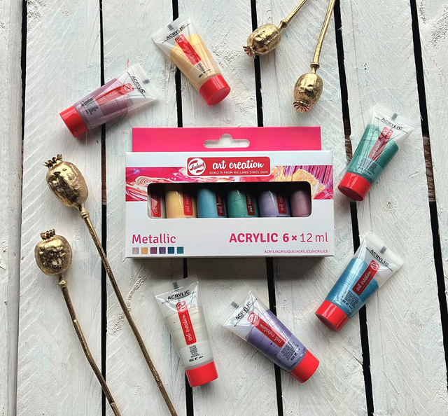 * Talens Art Creation acrylverf is een betrouwbare acrylverf op basis van acrylaathars. * De verf is pastueus, droogt snel en heeft een zijdeglans. * Deze acrylverf is direct uit de tube of verdund met water te gebruiken en droogt watervast op. * De kleuren zijn gemakkelijk met elkaar te vermengen en handig in gebruik door de doseerdop. * Deze veelzijdige verf kan op vrijwel elk oppervlak gebruikt worden, zolang die enigzins absorberend en vet- en stofvrij is. * Van canvas en papier tot gips, karton, hout, steen en cement. * Omdat de tubes transparant zijn kun je makkelijk de juiste kleur kiezen tijdens het schilderen. * Deze acrylverfset van 6 x 12 ml tubes biedt een goed palet aan metallickleuren om verschillende schilderijen mee te maken. * Door de handige maat zijn deze tubes ideaal om in je studio te hebben of om mee op reis te nemen. Talens Art Creation biedt ook sets van 8, 12 en 24 tubes en een startersset met alles wat je nodig hebt om met aquarelverf aan de slag te gaan. * Inhoud: 6 x 12ml tubes (800 Zilver – 801 Goud – 833 Metallicroze – 835 Metallicviolet – 834 Metallicblauw – 836 Metallicgroen).