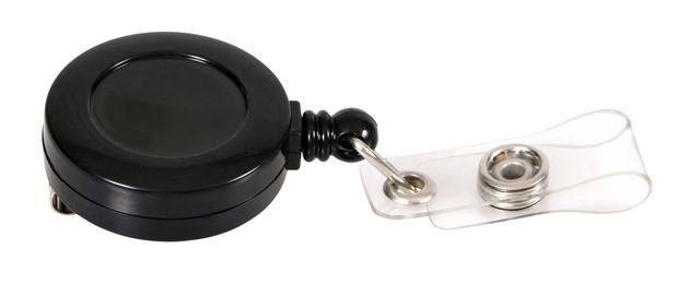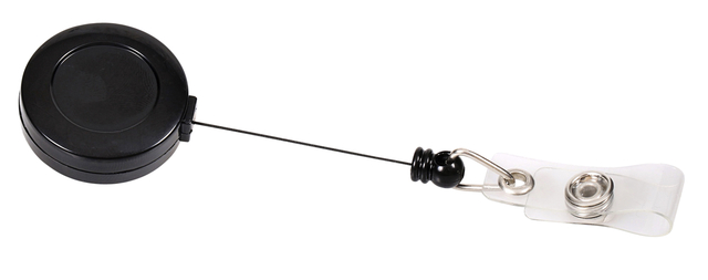 * Uittrekbaar afrolmechanisme voor badge- en pashouders. * Kunststof bevestigingsstrip met drukknop. * Metalen klem aan de achterzijde. * Lengte koord 80cm. * Kleur zwart. * Verpakt per 10 stuks.
