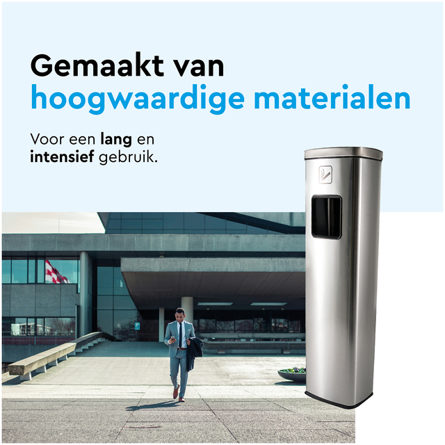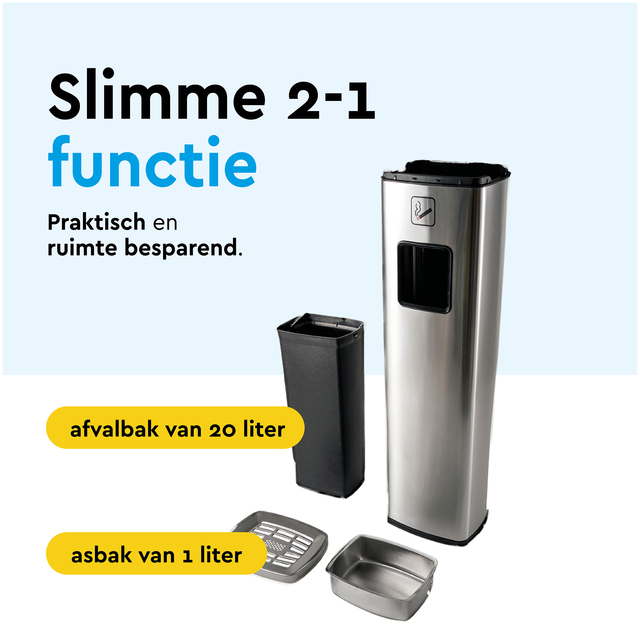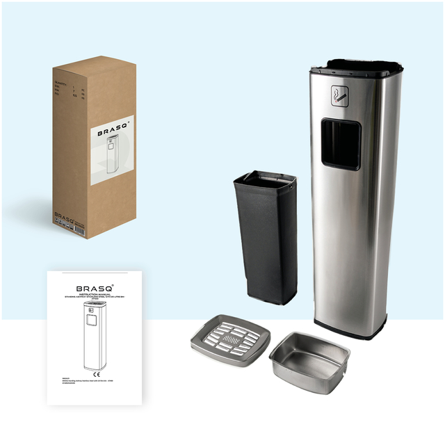 * De vierkante RVS BRASQ Asbak met afvalbak, ook wel vloerasbak, is de perfecte combinatie van functionaliteit en stijl voor zowel binnen als buitengebruik. Of je nu op zoek bent naar een praktische oplossing voor je kantoor, tuin of terras, deze robuuste prullenbak biedt alles wat je nodig hebt. * 2-in-1 ontwerp: prullenbak en asbak : Deze veelzijdige prullenbak, met een afmeting van 22x18x81cm(lxbxh), heeft een geïntegreerde RVS asbak van 1 liter, ideaal voor het tegengaan van sigarettenresten. Het asbakreservoir heeft ook een asbakdeksel waarmee sigaretten eenvoudig kunnen worden uitgedrukt. Het ontwerp zorgt voor een nette en geordende ruimte, zonder dat as of sigarettenpeuken rondslingeren. * Duurzaam en sterk materiaal: Gemaakt van roestvrij staal 410, staat deze prullenbak garant voor corrosiebestendigheid en een hoge hittebestendigheid, waardoor hij een lange levensduur heeft. De gegalvaniseerde binnencilinder van 20 liter, met hengsel, en de stevige coating zorgen voor extra duurzaamheid en bescherming tegen alle soorten weersomstandigheden. * Eenvoudig te reinigen: Zowel het asreservoir als de afvalemmer zijn eenvoudig te verwijderen voor snelle reiniging. Dankzij de praktische opzet haal je de onderdelen eenvoudig uit elkaar en kun je snel het vuil en as verwijderen met een vochtige doek, zodat het onderhoud van je prullenbak geen tijdrovende taak is. * Windbestendig voor buitengebruik: De rubberen rand aan de onderzijde voorkomt dat de prullenbak verschuift of krast op oppervlakten, terwijl het zorgt voor stabiliteit, zelfs bij een stevige wind. De prullenbak kan bij windkracht 4 buiten staan, en is ideaal voor gebruik op balkons, tuinen en terrassen. Om te voorkomen dat de prullenbak omvalt bij zwaardere wind, wordt aanbevolen om een zak zand in de binnenemmer te plaatsen voor extra stabiliteit. * Met zijn elegante vierkante ontwerp en praktische functies is deze rvs prullenbak met asbak een must-have voor elke (openbare)ruimte, zowel binnen als buiten. Bestel vandaag nog en geniet van een gebruiksvriendelijke en stijlvolle oplossing voor al je afval- en sigarettenrestbeheer. * Specificaties: Afmeting product: 22x18x81cm(lxbxh) * Gewicht product: 6,5 kg * Kleur: rvs * Materiaal: roestvaststaal 410 met kunststof binnenemmer * Inhoud asbak: 1 L * Inhoud afvalbak: 20L *