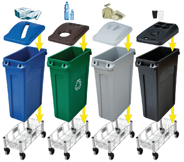 * De Industrienorm op het gebied van ruimtebesparend afvalbeheer en recycling. * Luchtsleuven maken het uitnemen van de afvalzak uiterst efficiënt en tijdbesparend. * Efficiente omvang en vorm voor gebruik in krappe ruimte. * Grepen aan de onderzijde voor meer grip tijdens het legen. * Uiterst duurzaam en breukbestendig. * Deksels in diverse kleuren en soorten openingen apart verkrijgbaar. * Optioneel zijn koppelbare verrijdbare onderstellen leverbaar.