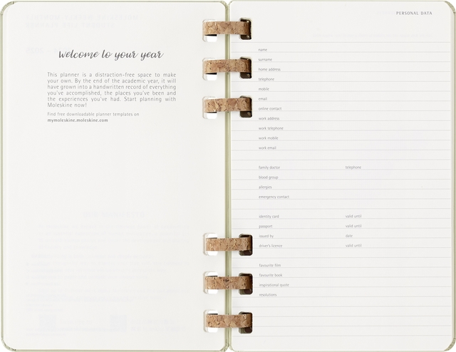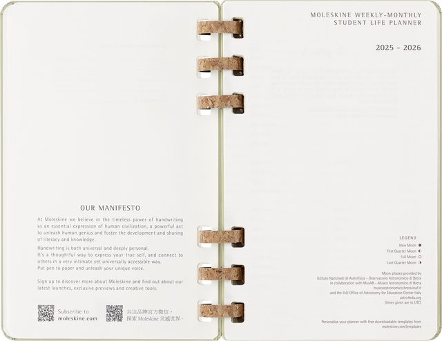 De Student Life Planner van Moleskine is ontworpen om de academische prestaties te verbeteren, georganiseerd te blijven en een gezonde balans tussen studie en privéleven te behouden. De planner bevat een maandelijkse en wekelijkse layout van twee pagina's om alles in te plannen, van dagelijkse afspraken en deadlines tot grote evenementen en langetermijnprojecten. Het boek biedt ruimte om roosters bij te houden, semesterdoelen en actieplannen in kaart te brengen en maandelijkse en jaarlijkse doelen te herzien. De Student Life Planner helpt ook bij het in evenwicht brengen van behoeften die verder gaan dan het academische leven met maandelijkse gewoontetrackers om te personaliseren, in te kleuren en aan te vullen, evenals een wekelijkse herinnering om je te concentreren op creativiteit en humeur. De planner is gedateerd van juli 2025 tot juni 2026 en de pagina's zijn gemaakt met papier van 100 g/m². Elke planner wordt geleverd met stickervellen en 3 bladwijzers om je planning te personaliseren. - Harde kaft, afgeronde hoeken, elastische sluiting - Flexibele en stevige spiraalbinding van kurk - Schutblad met melding 'in geval van verlies' - Ivoorkleurig 100 g/m² zuurvrij papier - Jaartal op voorblad in reliëf met bladgoud - Set stickers - 3 gelamineerde bladwijzers - Van juli 2025 tot juni 2026 - Moleskine srl. creëert en verkoopt FSC-gecertificeerde producten