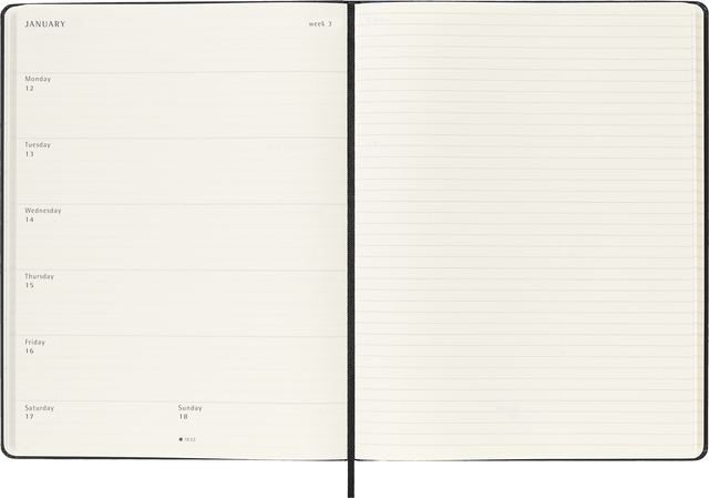 De Moleskine 18 Maanden Weekly Notebook Planner loopt van juli tot december. Deze populaire planner is ingedeeld om de afspraken van de week aan de linkerkant weer te geven en heeft een gelinieerde pagina voor notities en ideeën aan de rechterkant. Hierdoor is het notebook perfect voor studenten, docenten en professionals. De planner heeft een harde of zachte kaft met afgeronde hoeken en een elastische sluiting. - Harde kaft - Afgeronde hoeken - Elastische sluiting - Moleskine ivoorkleurig papier - Papiergewicht: 70 g/m² - Handige tools: planning, tijdzones, internationale metingen, toegangscodes en vluchtduur - Wereldwijde feestdagenkalender verkrijgbaar via moleskine.com/diaryaddons - Uitbreidbaar binnenvak passend bij de kleur van het notebook - "In geval van verlies" label gedrukt op het schutblad - Bijpassende bladwijzer voor lint - Herbruikbare paperband B-SIDE met extra gedrukte tools - 180° liggende opening - Moleskine srl. creëert en verkoopt FSC-gecertificeerde producten
