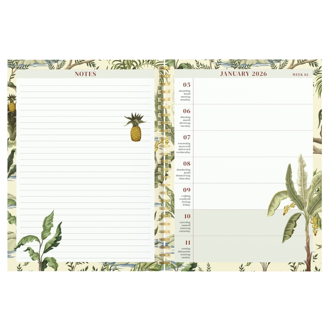 Met deze stijlvolle Botanic wire-o bureau agenda, hou je al je afspraken overzichtelijk bij de hand, en heb je dankzij het grotere formaat plaats genoeg om alles te noteren! Dankzij de wire-o ligt deze agenda mooi open en kan je makkelijk op beide pagina's schrijven. Binnenin vind je full coulour pagina's, met telkens 7 dagen op 2 pagina's, een jaar- en maandplanner en ruimte voor nota's. Het binnenwerk is in het Nederlands, Frans, Duits en Engels. De flexibele kaft heeft een matte finish, en de agenda is voorzien van een glitter-gouden elastische sluiting om alles op zijn plek te houden.