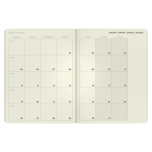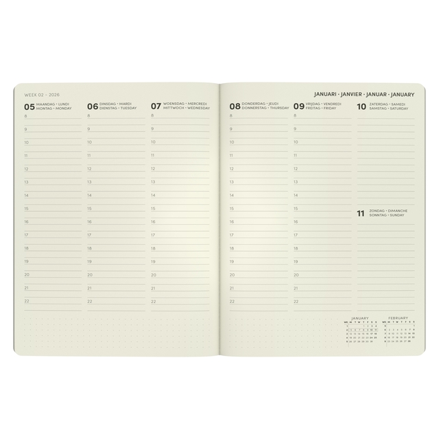 Met deze praktische QC Colour office agenda, hou je al je afspraken overzichtelijk bij de hand, en heb je dankzij het grotere formaat plaats genoeg om alles te noteren. Binnenin vind je telkens 7 dagen op 2 pagina's ingedeeld van 8h tot 22h en ruimte voor notities. Het binnenwerk is in het Nederlands, Frans, Engels en Duits. De harde kaft heeft een matte finish, afgeronde hoeken en een elastische sluiting.