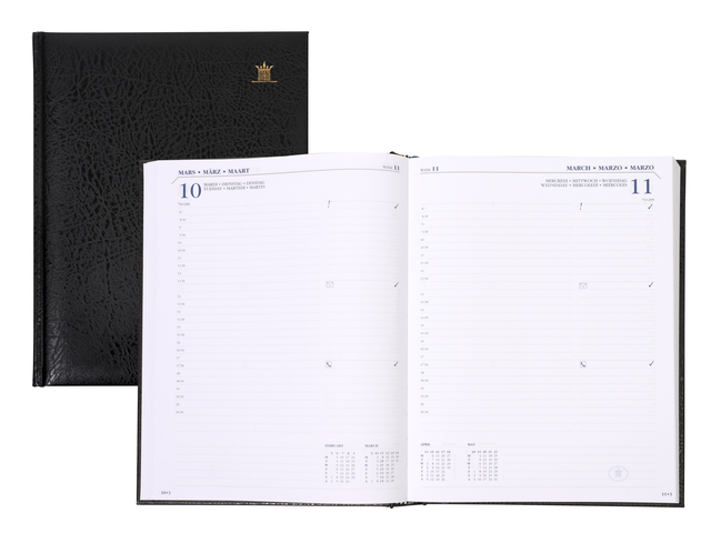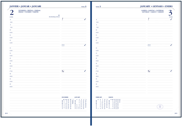 * Halfuur indeling van 8.00-20.30 uur. * Hoekperforatie. * Leeslint. * 70gr papier. * Tweekleurendruk. * Zestalig. * Maandkalenders op elke pagina. * Extra ruimte voor notities en telefoontjes. * Planpagina's. * Meegebonden adressenlijst 10 pagina's. * Garengebonden. * Gewatteerde kunstlederen omslag. * 14 maands kalender. * Start is 1 december en eindigt op 31 januari. * afmeting van de agenda 170x220mm.