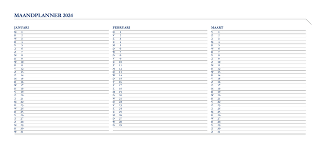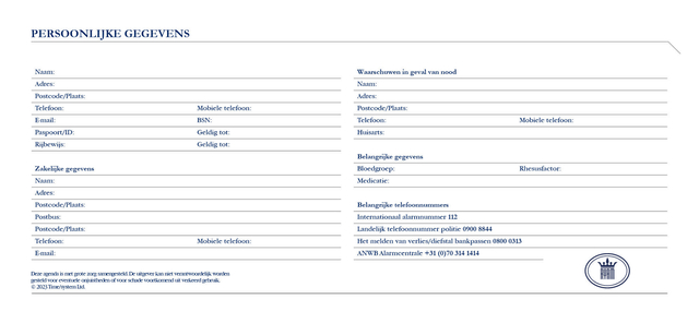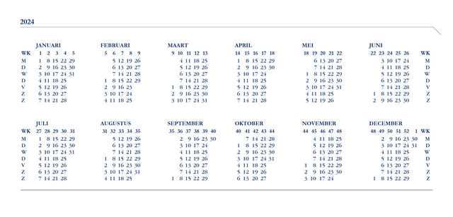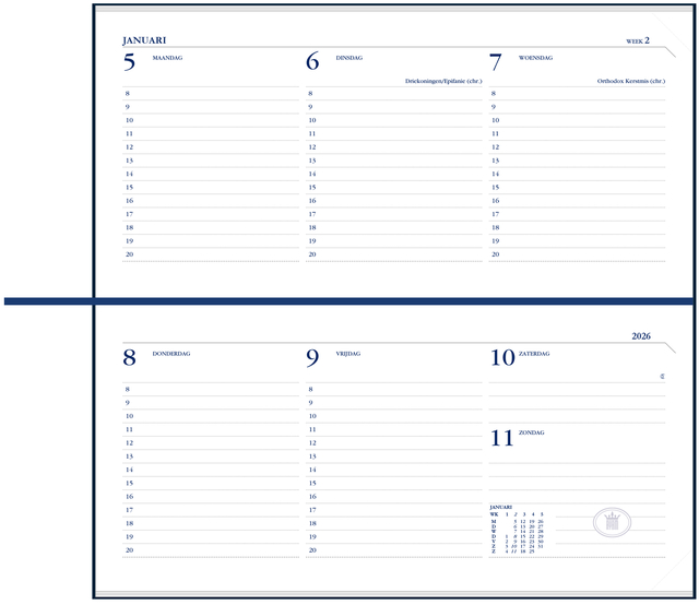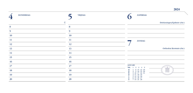 * Uurindeling van 8.00-20.00 uur. * 14 maanden. * Hoekperforatie. * Leeslint. * 70gr papier. * Tweekleurendruk. * 14 maands calendarium. * Garengebonden.