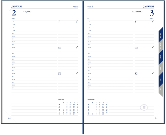 * 13,6x20,7cm. * Halfuurindeling van 8.00-19.00 uur. * Hoekperforatie. * Uitgestanste maandtabs. * Leeslint. * 70gr papier. * Tweekleurendruk. * Nederlandstalig. * 14-maands kalender. * Maandkalender op elke pagina. * Extra ruimte voor notities en telefoontjes. * Planpagina's. * 24 pagina's vewisselbaar alfabet. * Garengebonden. * Gewatteerde kunstlederen omslag.