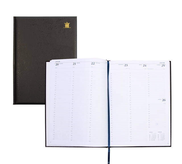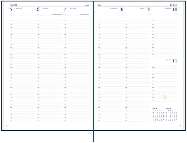 * Halfuurindeling van 7.00-22.00 uur. * Hoekperforatie. * Leeslint. * 70gr papier. * Tweekleurendruk. * Nederlandstalig. * Maandkalender op elke spread. * Meegebonden adressenlijst 12 pagina's. * Garengebonden. * 14 maands calendarium. * Gewatteerde kunstlederen omslag.