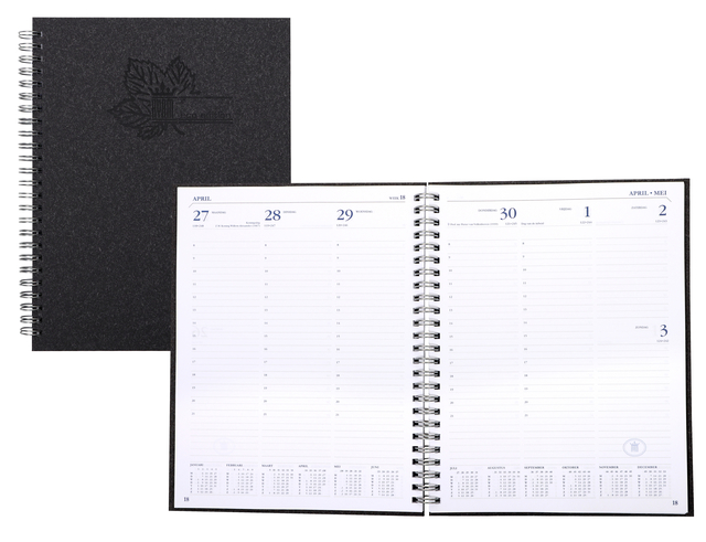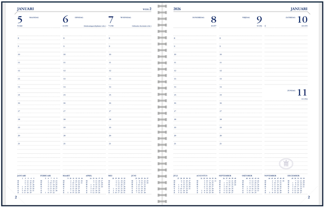 * Uurindeling 8.00-21.00 uur. * Hoekperforatie. * 70gr papier. * Tweekleurendruk. * Nederlandstalig. * 14 maands calendarium. * Jaarkalender op elke pagina. * Extra ruimte voor notities en telefoontjes. * Meegebonden adressenlijst. * Gebonden met metalen spiraal. * Harde omslag.