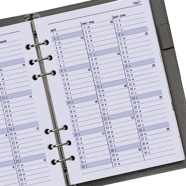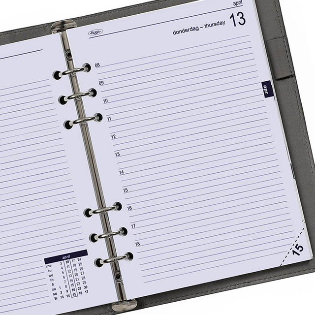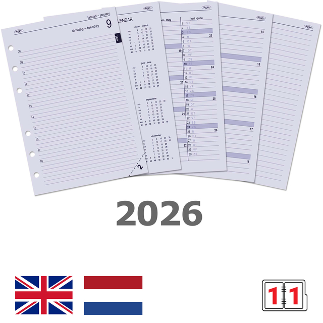 * A5 navulling 1 dag per pagina: Deze navulverpakking past perfect in uw agenda. * U krijgt 360 pagina's wit papier met blauwe opdruk, met één dag per pagina en tijdsindeling van 8:00 uur tot 18:00 uur. * De urenindeling is voorgedrukt op de pagina. * Elke tweede dag is er een klein blokje met de dagen van de maand. * De afmetingen zijn: 145x210 mm papier, gatenafstand van 19 - 19 - 70 - 19 - 19 mm. * Daarnaast bevat het een jaarplanner voor 2025 en 2026. * De taal is zowel in het Nederlands als in het Engels. * Dit navulpakket werkt met A5 organizers van vele populaire merken, waaronder Kalpa, Succes, en Filofax. Houd uw agenda georganiseerd en op koers!
