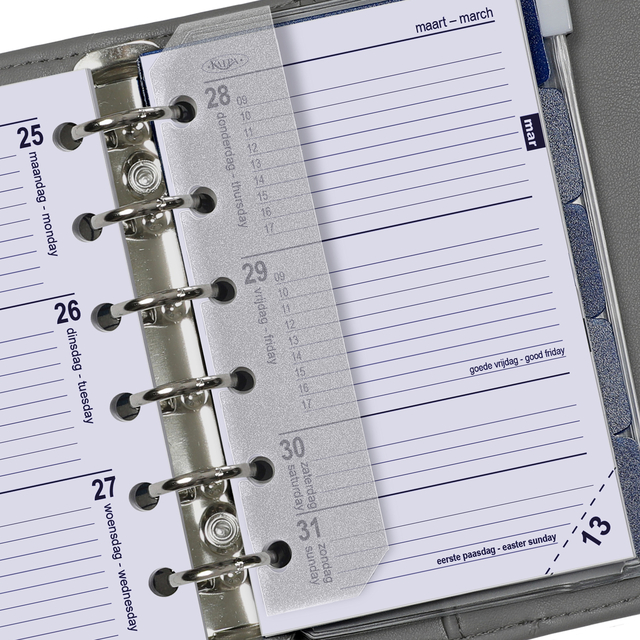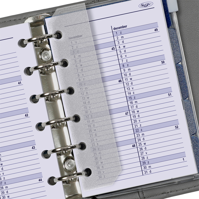 * Pocket jaardoos 1 week per 2 pagina's. * Bij de jaardoos krijgt u het complete calendarum (no 6237-25). * U krijgt extra 5 tabbladen, een adresset, paginascheider, een ritshoesje en een bewaardoos die u ook kunt gebruiken om uw agendavulling van vorig jaar te bewaren. * Houd uw Junior agenda georganiseerd met deze navulverpakking. * Het past perfect in uw agenda. * U krijgt 160 pagina's wit papier met blauwe opdruk, met één week per 2 pagina’s en tijdsindeling van 9:00 uur tot 18:00 uur. * U kunt al uw afspraken in haar bijhouden. * Met een week voor elke pagina heeft u maximale ruimte voor uw afspraken. * De urenindeling van 9:00 tot 18:00 uur is voorgedrukt op de pagina. * De afmetingen zijn: 80x125mm papier, gatenafstand van 19 - 19 - 19 - 19 - 19mm. * Daarnaast bevat het een jaarplanner voor 2025 en 2026. * De taal is zowel in het Nederlands als in het Engels. * Dit navulpakket werkt met Pocket en Junior organizers van vele populaire merken, waaronder Kalpa, Succes Junior, en Filofax. * Houd uw agenda georganiseerd en op koers!