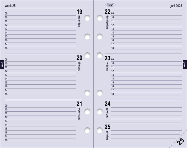 * Senior vulling 1 week op 2 pagina's : houd uw Senior agenda georganiseerd met deze navulverpakking. * Het past perfect in uw agenda. * U krijgt 160 pagina's wit papier met blauwe opdruk, met één week op 2 pagina's en een voorgedrukte tijdsindeling van 9:00 uur tot 18:00 uur. * Houd uw agenda georganiseerd met deze navulling. * U heeft maximale ruimte voor uw afspraken. * De afmetingen zijn: 95x150 mm papier, gatenafstand van 19 - 19 - 38 - 19 - 19 mm. * Daarnaast bevat het een jaarplanner voor 2025 en 2026. * De taal is zowel in het Nederlands als in het Engels . * Dit navulpakket werkt met Senior organizers van vele populaire merken, waaronder Kalpa, Succes, en Filofax. * Houd uw agenda georganiseerd en op koers!