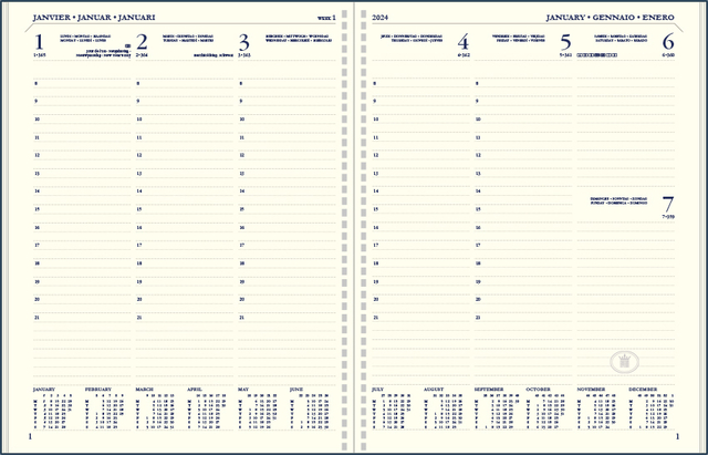 * Uurindeling van 8.00-21.00 uur. * Hoekperforatie. * Crèmekleurig 70gr papier. * Tweekleurendruk. * Zestalig. * Jaarkalender op elke pagina. * Extra ruimte voor notities en telefoontjes. * Planpagina's. * Meegebonden alfabet 6 pagina's. * Ringplasic. * 14 maands calendarium.