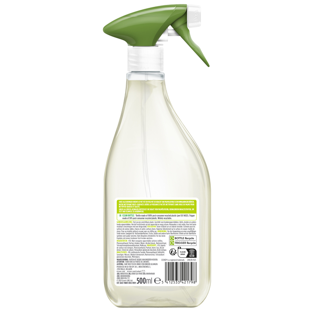 * Reinigt oppervlakken snel en gemakkelijk van vet en vuil met de kracht van palmolievrije reinigingsmiddelen. Geschikt voor keukenoppervlakken, tafels, stoelen en andere harde oppervlakken. * Met biologisch afbreekbare ingrediënten * Palmolievrije reinigingsmiddelen. * Citroengras & sinaasappel geur. * Geschikt voor septische tanks. * Vegan formule & verpakking. * Fles body is gemaakt van 100% gerecycled plastic, grotendeels recyclebaar. Sproeikop gemaakt van 30% gerecycled plastic (PCR). * Gevarenaanduidingen: H318, cat. 1: Veroorzaakt ernstig oogletsel. H319, cat. 2A: Veroorzaakt ernstige oogirritatie. * Veiligheidsaanbevelingen: P102: Buiten het bereik van kinderen houden.