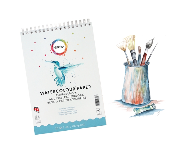 * Of je nu een beginner bent of een professionele kunstenaar, dit aquarelblok van Qrea is geschikt voor iedereen! * Ideaal papier voor de eerste stappen in het aquarelleren en andere natte technieken.* Dit aquarelblok heeft een dubbele spiraal. * Het bevat zuurvrij papier, dat niet vergeelt niet na verloop van tijd. * Het harde karton aan de onderkant zorgt voor optimaal gebruiksgemak. * Afmeting: A4 formaat. * Blok à 20 vellen 200 grams papier. * Diverse formaten beschikbaar. * Geproduceerd in Nederland.