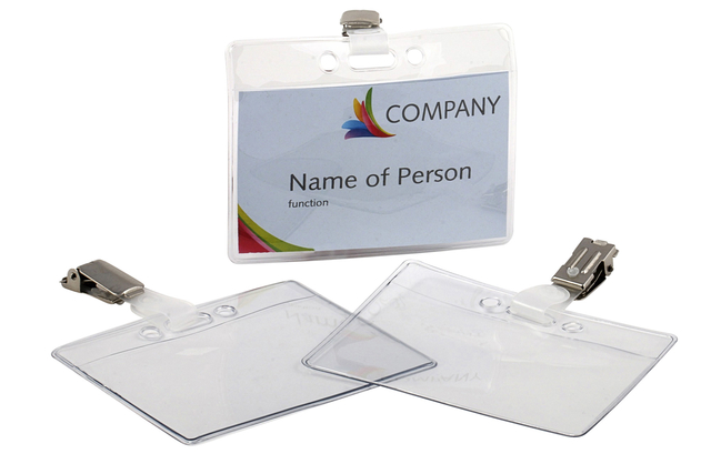 * Badge gemaakt van helder transparant soepel PVC. * Met voorgeponste ronde gaten en sleuf. Ook geschikt voor bezoekerspas. * Voorzien van een strip met bretelclip die in de voor geponste sleuf kan worden bevestigd. * Hierdoor blijft de badge altijd recht hangen. * Afmeting badge breedte x hoogte 90x60mm. * Geschikt voor kaartjes 90x60mm. * Doosje met 24 badges en losse insteekkaartjes.