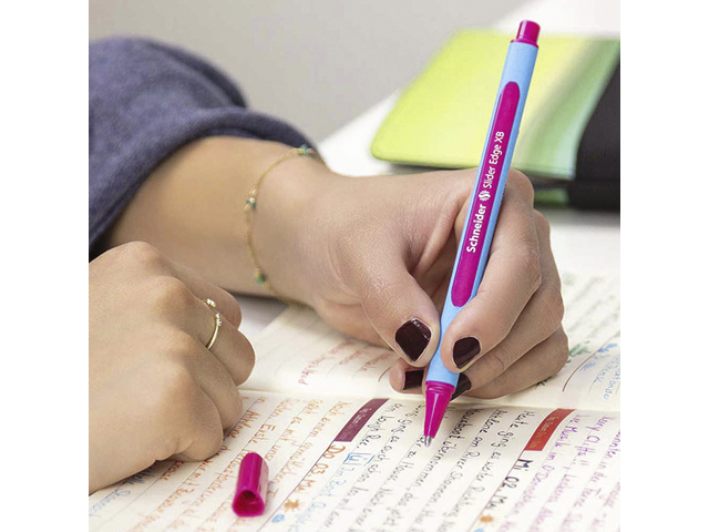 * Balpen met rubberen 3-kantige schacht voor ontspannen schrijven. * De dop kan omgedraaid worden. * De Slider Edge kan niet rollen op het buro en de slanke uitvoering past goed in een pennenlade of penetui. * Vlekvrij, ook in combinatie met een tekstmarker. * Uitvoering in Extra Breed (XB). * Etui a 6 stuks assorti. * Schrijflengte ca 2.000 meter.