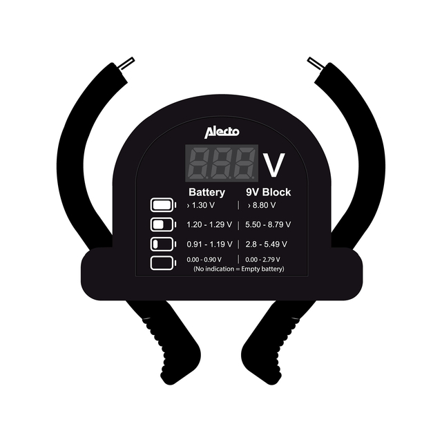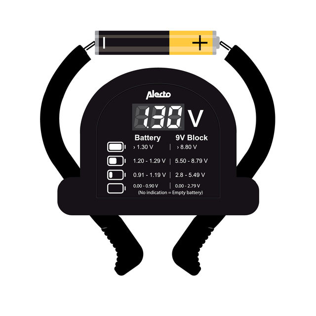 * De Alecto BTT2 is een universele batterijtester waarmee je op het digitale display in één oogopslag kunt zien wat de status is van de capaciteit van je batterij. * De BTT2 is eenvoudig te gebruiken en werkt bij alle veel gebruikte batterijen, zoals: AA, AAA, C, D, 9V blok. * Plaats de batterij op de juiste manier tussen de + en - kant van de batterijtester (een 9V batterij plaats je onderin). * De houders zijn flexibel en kunnen de formaten van de meest gangbare batterijen aan. * Met een goede plaatsing van de batterij lees je op de batterijtester direct de status van de batterij af. * Er zijn 4 verschillende waarden die duidelijk vermeld staan op de tester.
