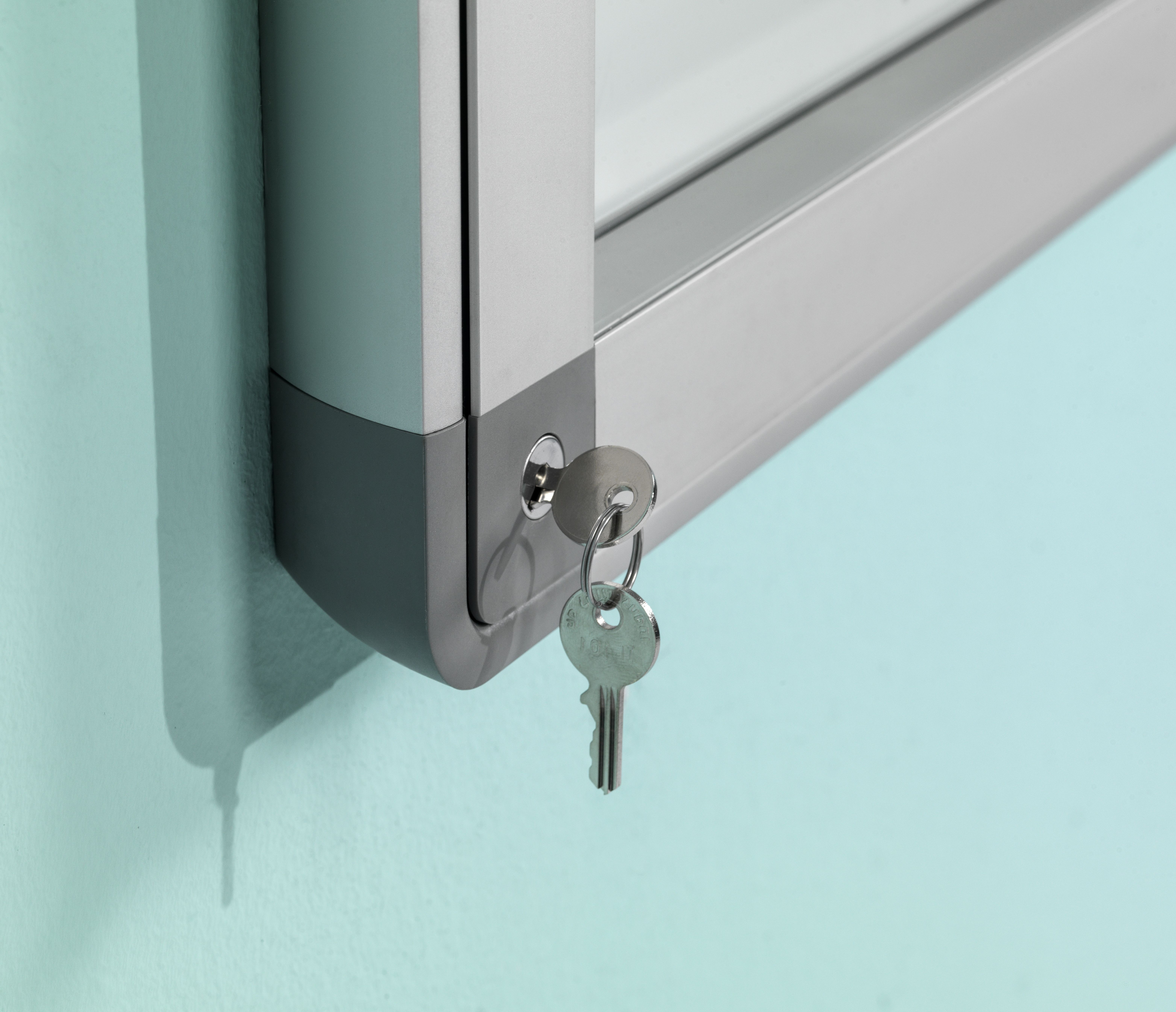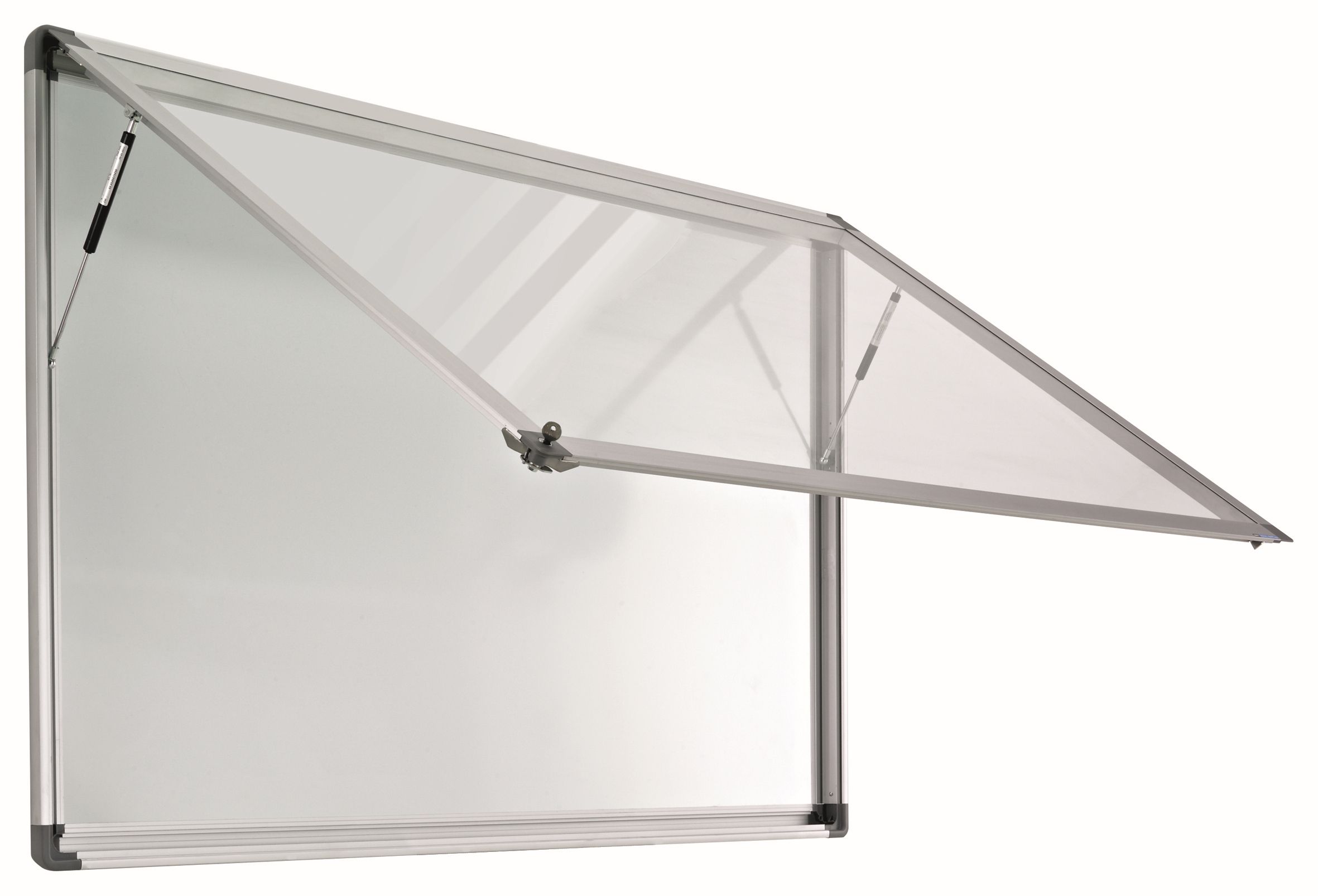 Spatwaterdichte muurvitrine, voor binnen- en buitengebruik. Gemaakt van geanodiseerd aluminium, voorzien van een wit gelakt stalen achterpaneel en grijze kunststof hoekstukken. Magnetisch en droog-uitwisbaar. Vleugeldeur van gehard veiligheidsglas , voorzien van slot met twee sleutels. Profieldikte: 5,5 cm rondom.