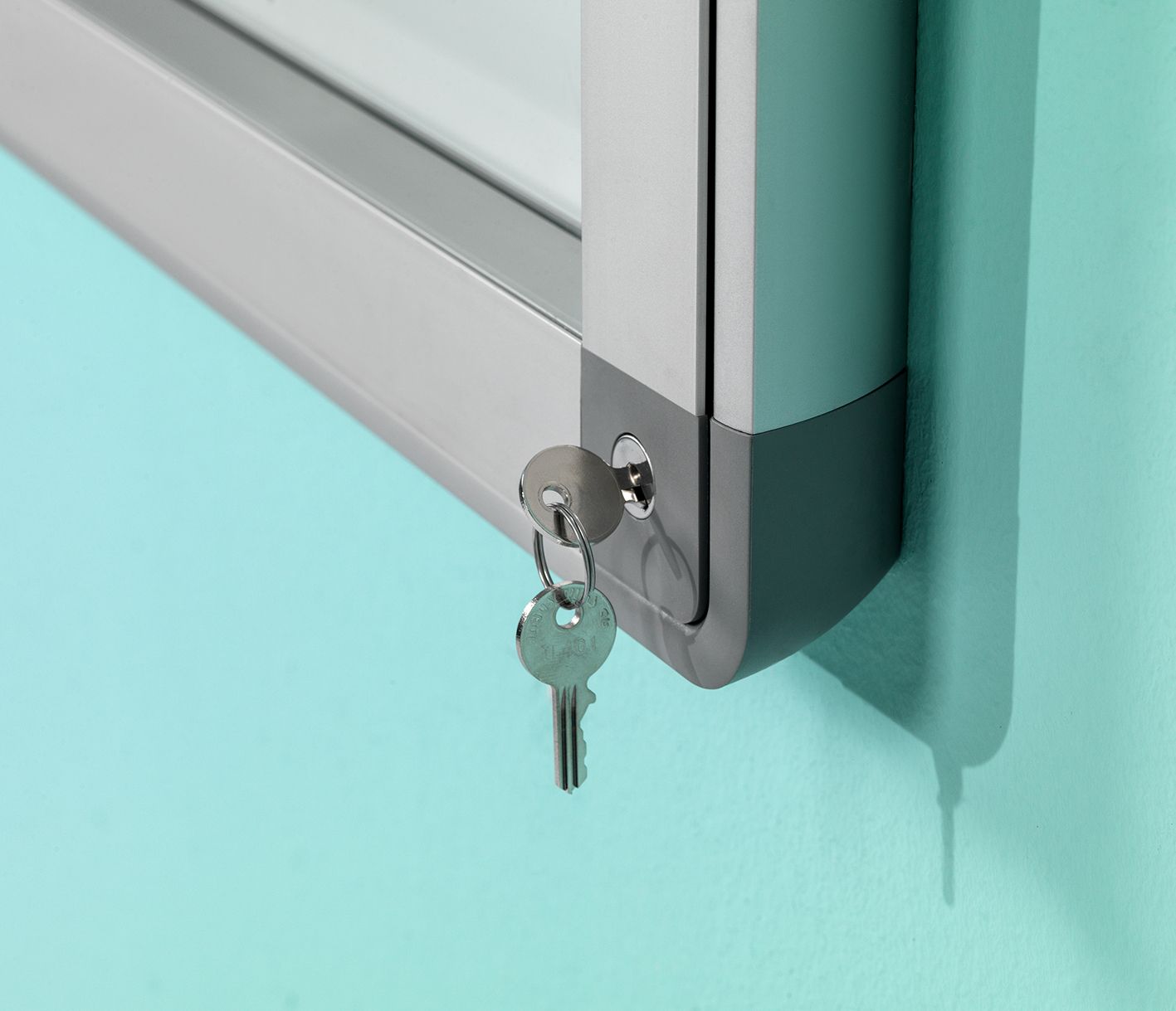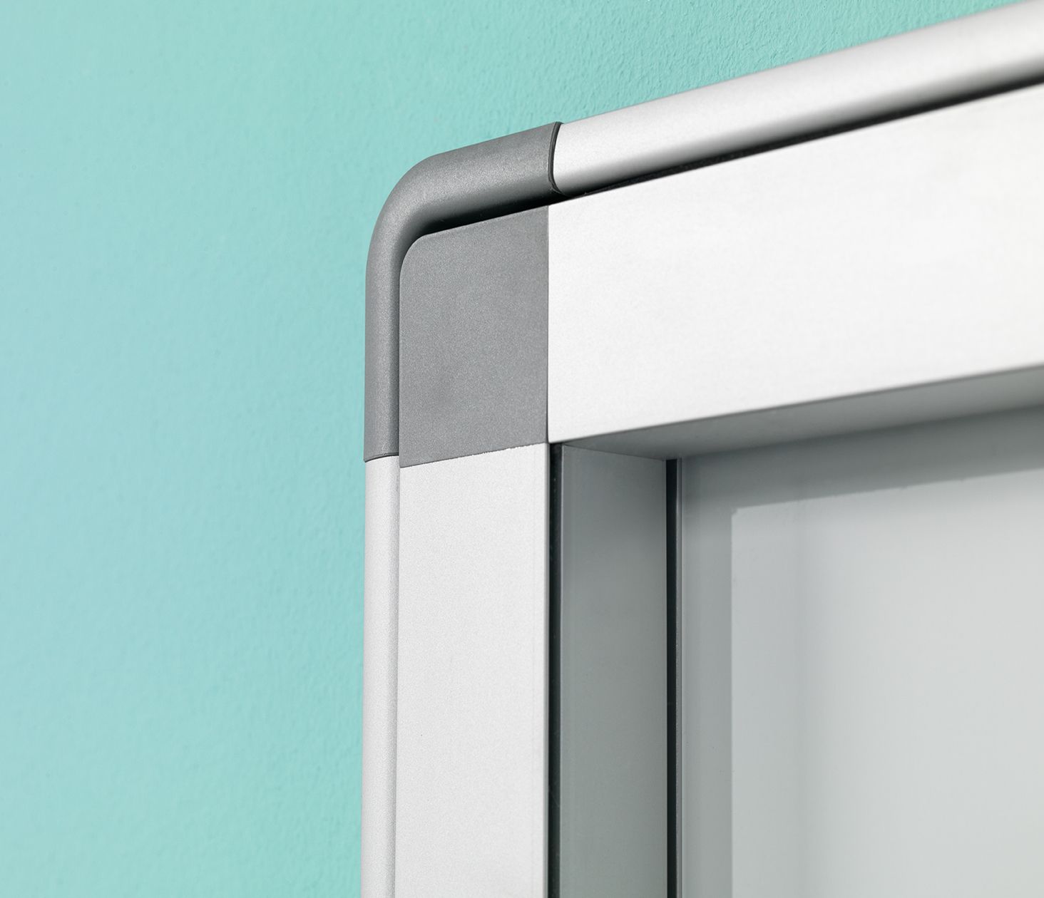 Spatwaterdichte muurvitrine, voor binnen- en buitengebruik. Gemaakt van geanodiseerd aluminium, voorzien van een wit gelakt stalen achterpaneel en grijze kunststof hoekstukken. Magnetisch en droog-uitwisbaar. Vleugeldeur van gehard veiligheidsglas , voorzien van slot met twee sleutels. Profieldikte: 5,5 cm rondom.