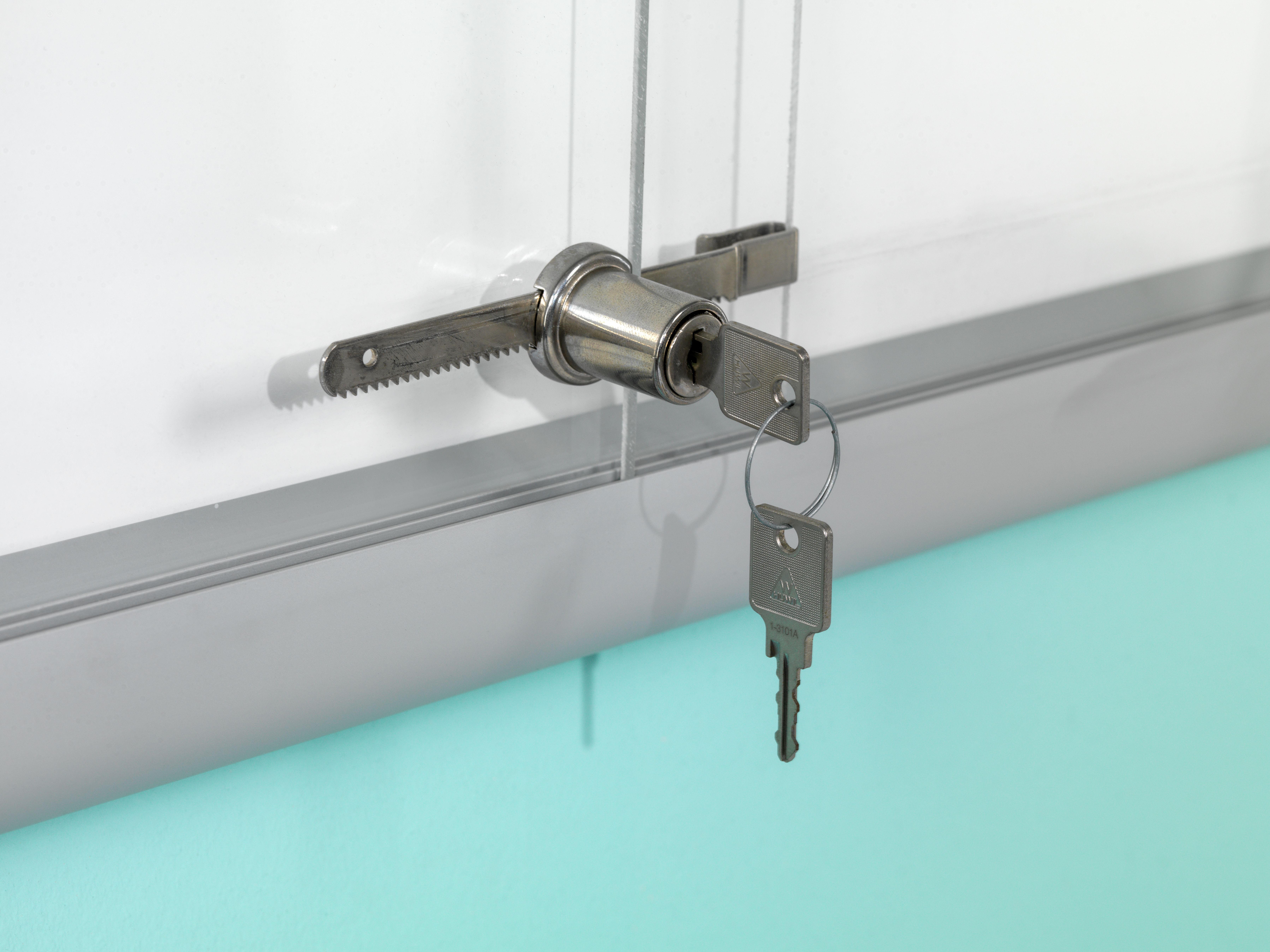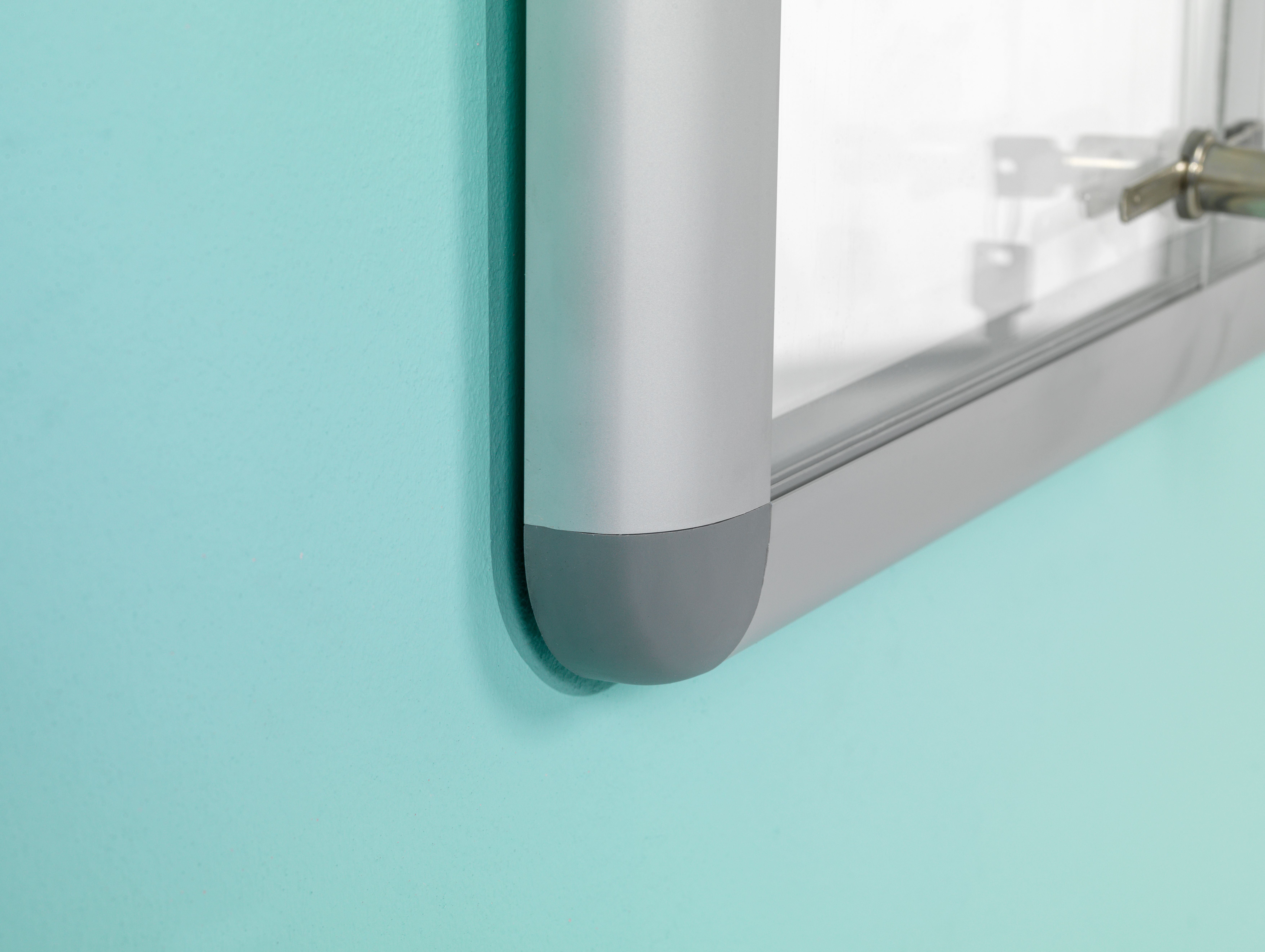 Met schuifdeuren, voor binnen gebruik. Gemaakt van geanodiseerd aluminium met een wit stalen achterpaneel en grijze kunststof hoekstukken. Magnetisch achterpaneel (niet uitwisbaar). Schuifdeuren van plexiglas, met slot en twee sleutels. Profiel dikte: 5 cm rondom.