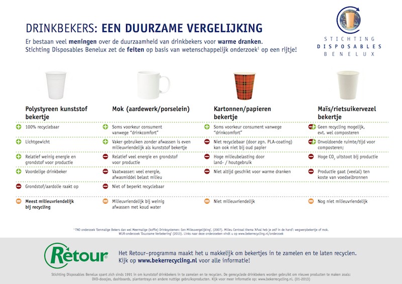 - Omdat het polystyreen kunststof bekertje bovendien 100% recyclebaar is; als plastic wegwerpbekers worden gerecycled, dan is de milieuwinst dus nog groter. Daarvoor is het wel essentieeel dat ze gescheiden bij het plastic afval worden aangeboden (of opgehaald voor recycling).
