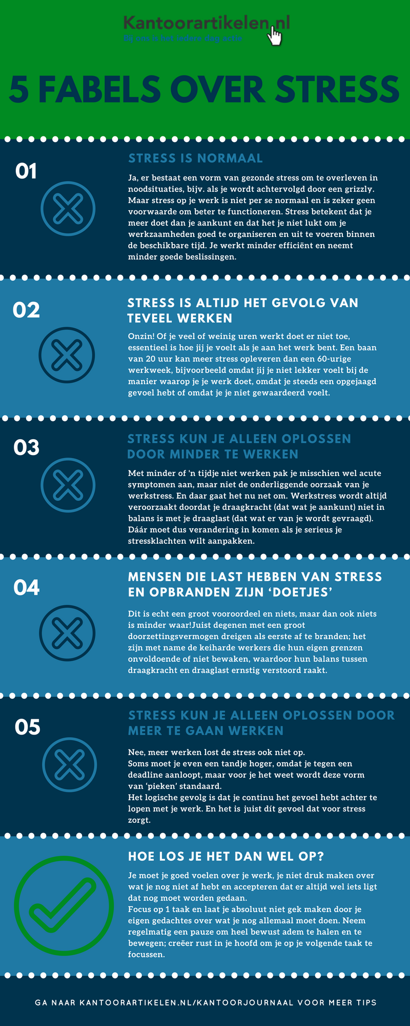 Over stress valt veel te lezen en er wordt veel over gepraat. Je leest en hoort weliswaar veel waarheden, maar er wordt vooral ook heel veel onzin over stress verkondigd. Hoogste tijd om de 5 grootste stress-fabels te ontmaskeren. Wij hebben ze voor je samengevat in een handige infographic.