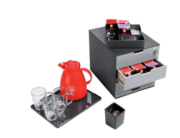 Als je er plaats voor hebt, creëer een comfortabele eetruimte met tafels en stoelen waar medewerkers kunnen ontspannen tijdens hun pauze. Denk aan een mix van zitmogelijkheden, zoals hoge tafels met krukken en lage tafels met stoelen, om aan verschillende voorkeuren te voldoen. Een goed ingerichte kantine bevordert de teamdynamiek en biedt een plek voor informele bijeenkomsten.Keukenaccessoires