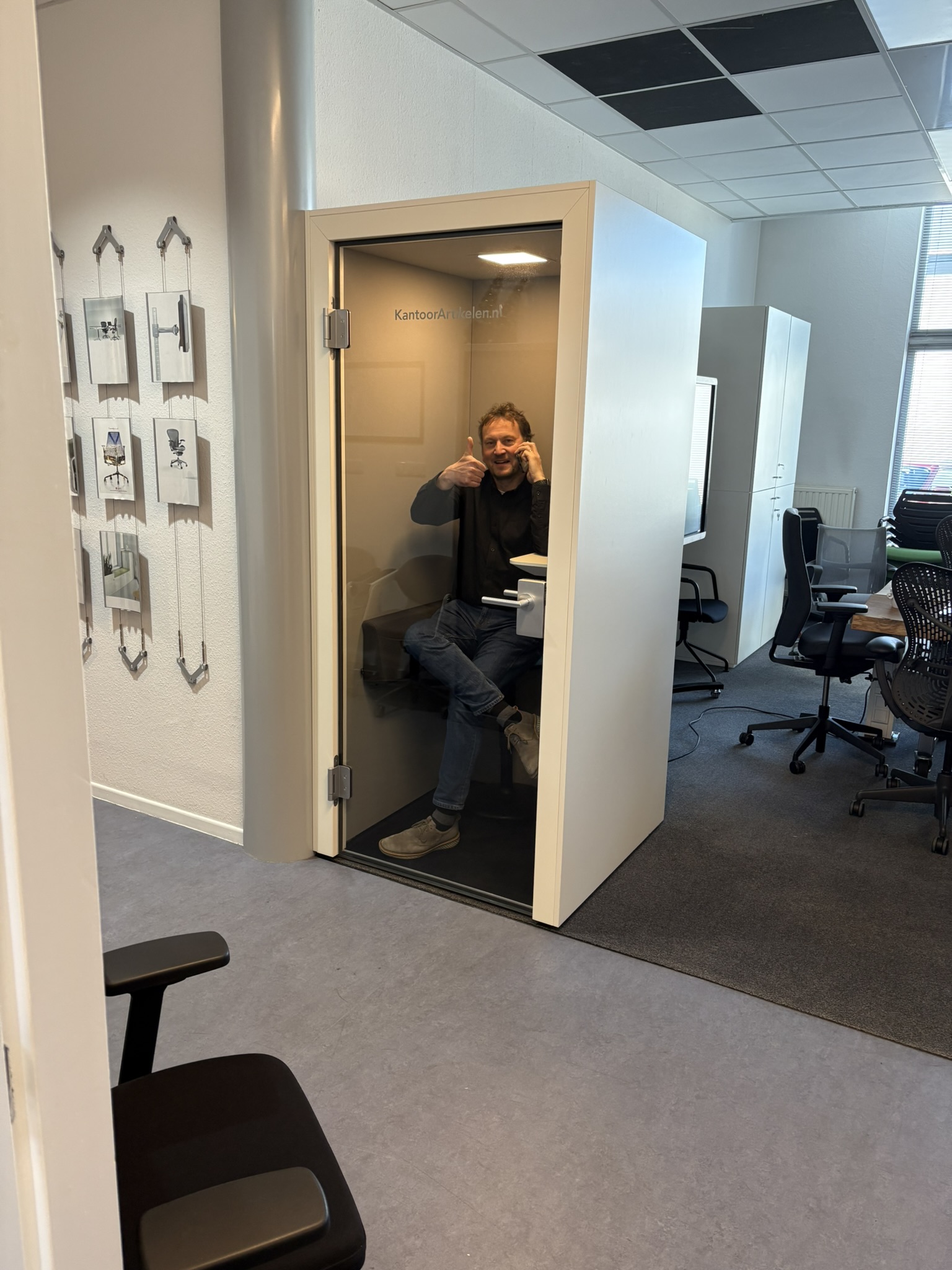 Op deze foto’s zie je een van onze populaire producten: een moderne telefooncel. Ideaal voor open kantoorruimtes waar privacy en geluidsdemping belangrijk zijn. Deze cabines zijn gemaakt van hoogwaardige materialen en bieden een duurzame oplossing voor een betere werkomgeving. Natuurlijk gebruiken wij deze zelf ook dagelijks op kantoor!