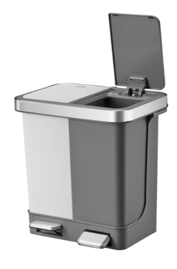 Met twee afzonderlijke binnen-emmers biedt dit model een compacte en stijlvolle oplossing voor gescheiden afvalinzameling. - EKO Essential Recycler pedaalemmer (2×22 L, 2×30 L, 3×20 L)