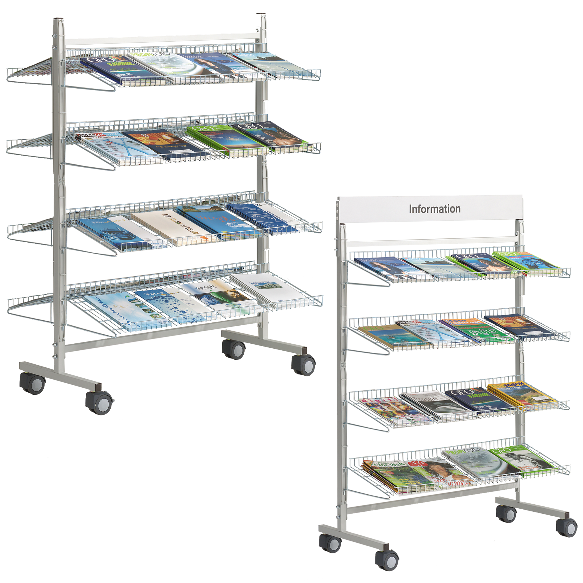 Deze mobiele brochure- en krantenstandaard op vier stevige wielen, waarvan er twee vergrendelbaar zijn, is perfect om uw informatiebrochures en kranten netjes en binnen handbereik op te bergen en perfect te presenteren. Het frame is gemaakt van gepoedercoat staalbuis. Alle buiseinden zijn afgedicht met eindkappen. Vier zwenkwielen, waarvan er twee kunnen worden vastgezet, zorgen voor een gemakkelijke mobiliteit en een stevige stand.De brochurestandaard is verkrijgbaar in verschillende uitvoeringen. Hij is enkelzijdig verkrijgbaar met vier opbergvakken of dubbelzijdig met acht opbergvakken. De opbergvakken hebben een diepte van 36 cm en zijn daarom compatibel met DIN 500 vel het meest geschikt? " target="_blank">500 vel het meest geschikt? " target="_blank">A4-brochures en -flyers. Om de brochurestandaard perfect aan te passen aan uw ruimteconcept, kunt u het frame ook in verschillende RAL-kleuren krijgen.