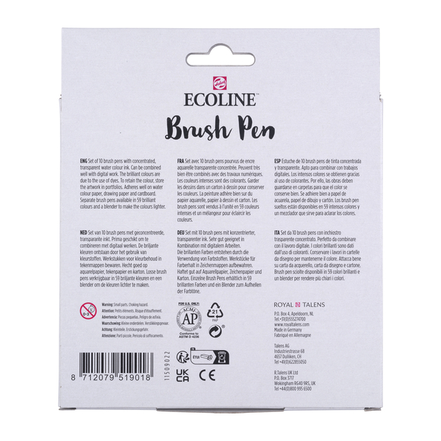 * Deze set bevat 10 Ecoline Brush Pens in levendige basistinten. * De Brush Pen kenmerkt zich door de flexibele punt en het uitgebreide assortiment schitterende kleuren dankzij de pure formule op kleurstofbasis. * De transparante kleuren bieden de beste resultaten bij gebruik op wit of zeer lichtgekleurd papier. Indien gewenst kun je de kleurintensiteit gemakkelijk verminderen door ze te verdunnen met water of met de Brush Pen blender (apart verkrijgbaar). * Deze pennen zijn perfect voor handlettering, aquareltekeningen, snelle schetsen en finishing touches. * Briljante kleuren op basis van kleurstof en arabische gom. * Handige pen met flexibele punt. * Vermeng kleuren met water en een penseel voor prachtige aquareleffecten en naadloze kleurovergangen. * Hecht goed op aquarelpapier, tekenpapier en karton. * Berg horizontaal op zodat de kleurstof gelijkmatig verdeeld blijft. * Breng uitgedroogde nibs weer tot leven door ze nat te maken met water. * Inhoud: 10 Brush Pens: 205 Citroengeel (Primair) - 227 Gele Oker - 237 Diep Oranje - 334 Scharlaken - 337 Magenta - 548 Blauw Violet - 506 Ultramarijn Diep - 578 Hemelsblauw (Cyaan) - 600 Groen - 700 Zwart).