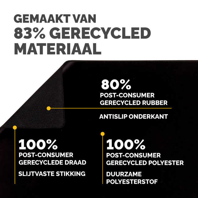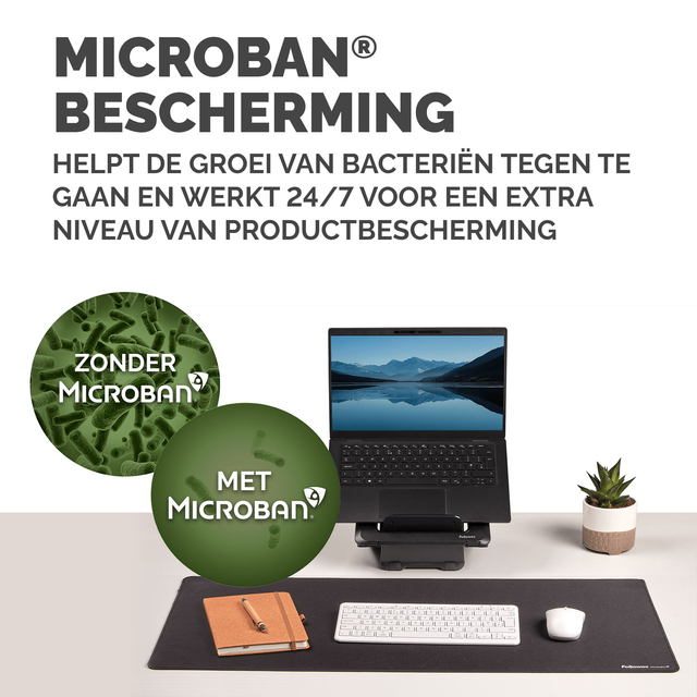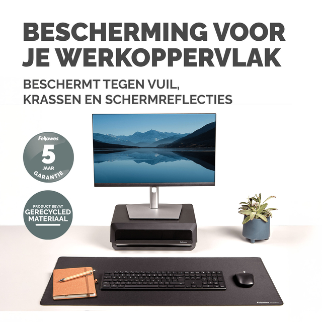 Ruime bureaumat beschermt tegen vuil en krassen en zorgt voor een niet-reflecterend werkoppervlak. Biedt een comfortabel oppervlak om te schrijven en te typen en verbetert de prestaties van de muis. Ingebouwde Microban®-bescherming helpt de groei van bacteriën te voorkomen en werkt 24/7 voor een extra niveau van productbescherming. Gemaakt van 83% gerecycled materiaal. Antislip onderkant houdt de mat de hele dag op zijn plaats. Duurzame platte stiksels voorkomen rafelen. Gemaakt om lang mee te gaan, met 5 jaar garantie.