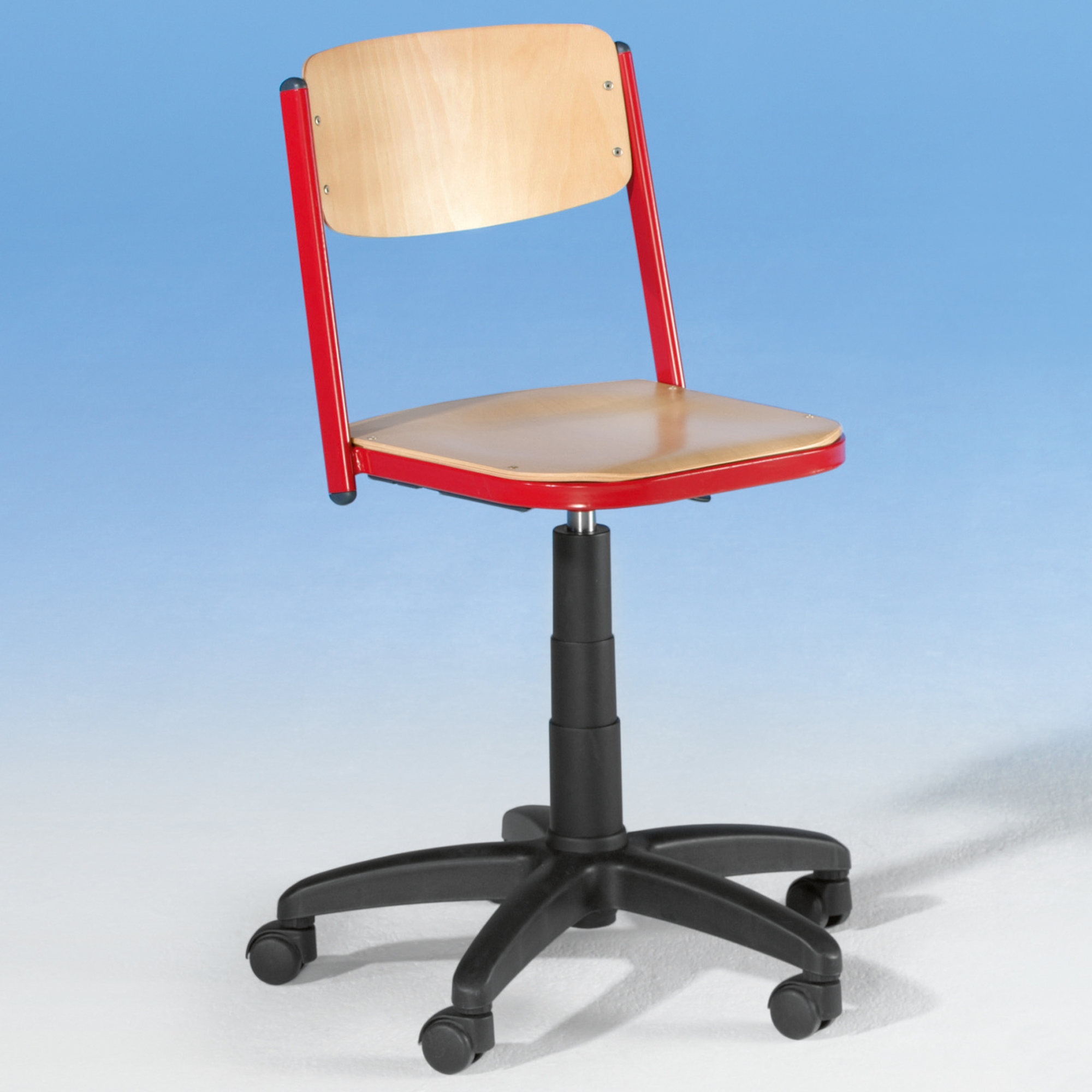 Onze bureaustoel is in hoogte verstelbaar van 50 tot 69 cm dankzij de verborgen draadspindel. Het staat op een vijfpotig frame met wieltjes. De zitschaal in beuken decor bestaat uit meervoudig verlijmd multiplex en is beveiligd tegen losschroeven.