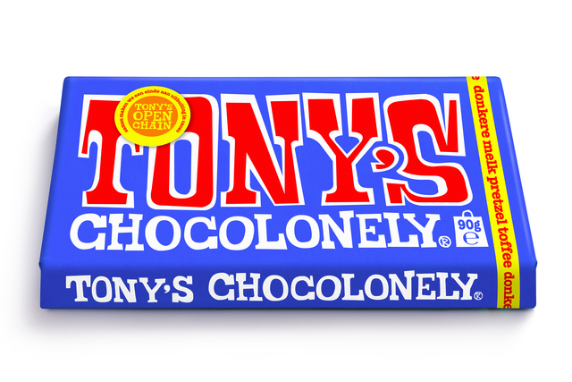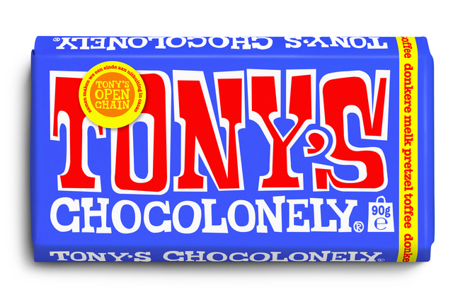 Chocolade Tony's Chocolonely donkere melk pretzel toffee reep 90 gram