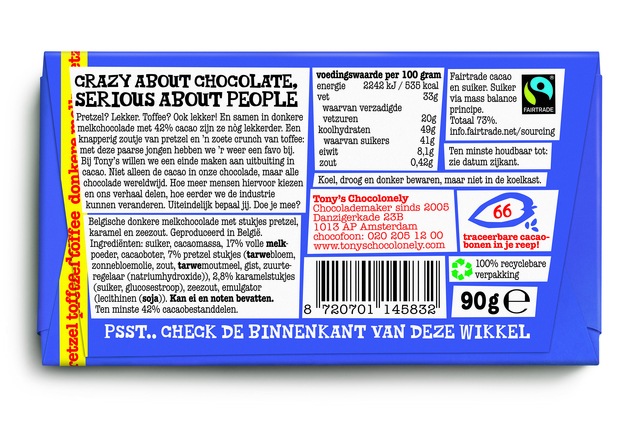 Pretzel? Lekker. Toffee? Ook lekker! En samen in donkere melkchocolade met 42% cacao zijn ze nòg lekkerder. Een knapperig zoutje van pretzel en 'n zoete crunch van toffee: met deze paarse jongen hebben we 'r weer een favo bij. Nu in 'n kleiner reepje! Tony's chocolonely - samen maken we een einde aan uitbuiting in cacao! Bij tony's willen we een einde maken aan uitbuiting in cacao. Niet alleen de cacao in onze chocolade, maar alle chocolade wereldwijd. Hoe meer mensen hiervoor kiezen en ons verhaal delen, hoe eerder we de industrie kunnen veranderen. Uiteindelijk bepaal jij, doe je mee?