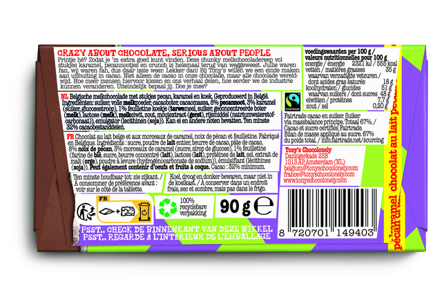 Eigenschappen "Chocolade Tony's Chocolonely melk karamel pecan crunch reep 90 gram"