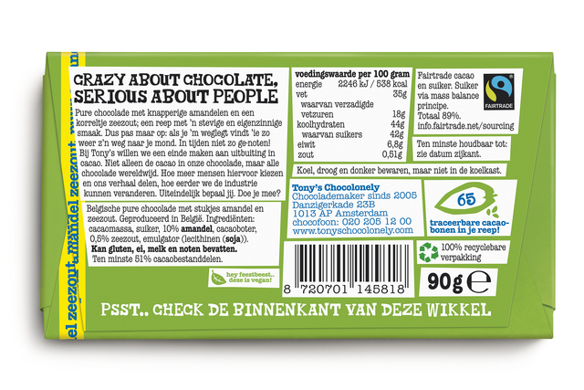 Pure chocolade met knapperige amandelen en een korreltje zeezout: een reep met 'n eigenzinnige smaak. Pas maar op: als je 'm weglegt vindt 'ie zo weer z'n weg naar je mond. In tijden niet zo ge-noten. Nu in 'n kleiner reepje! Tony's chocolonely - samen maken we een einde aan uitbuiting in cacao! Bij tony's willen we een einde maken aan uitbuiting in cacao. Niet alleen de cacao in onze chocolade, maar alle chocolade wereldwijd. Hoe meer mensen hiervoor kiezen en ons verhaal delen, hoe eerder we de industrie kunnen veranderen. Uiteindelijk bepaal jij, doe je mee?