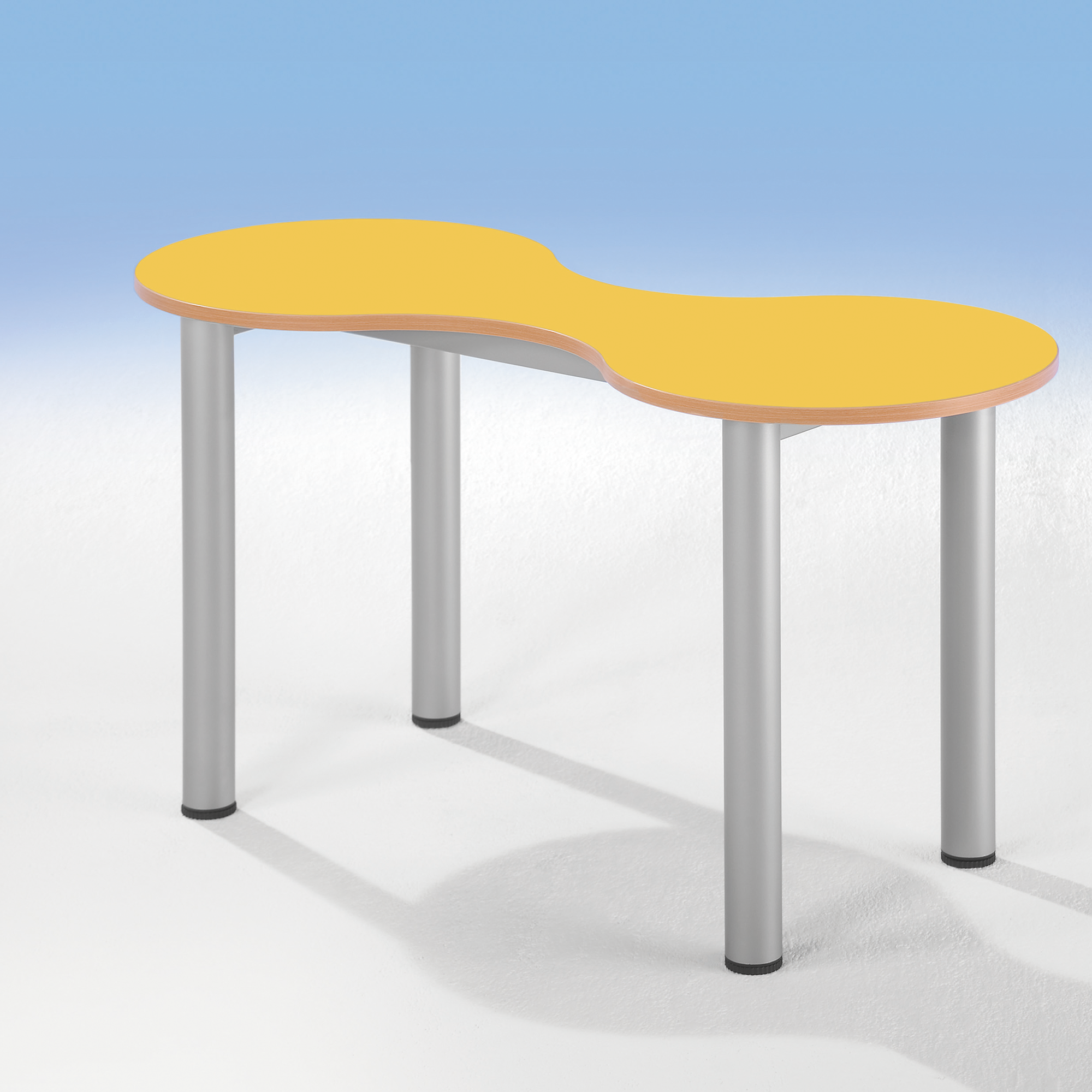 Het tafelblad van de klaverbladtafel is gemaakt van 19 mm dik, gemelamineerd spaanplaat in de milieuvriendelijke E1-kwaliteit. Het is bijzonder gemakkelijk schoon te maken en kan met een vochtige doek worden afgeveegd. Het tafelblad is verkrijgbaar in vrolijke decors, de tafelrand is altijd in beuken decor. Het tafelonderstel bestaat uit een stabiele ronde buis van 40 mm. De kozijnen worden in ons huis milieuvriendelijk gepoedercoat volgens Duitse kwaliteitsnormen. De klaverbladtafels zijn naar wens met elkaar te combineren. We hebben tafels voor twee, drie en vier personen.